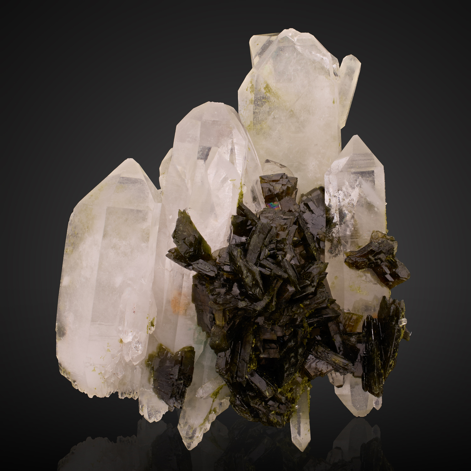 A neat classic Chinese combo of quartz and epidote from the Hongquizhen Quarry. This is complete and crystallized all around – in superb condition.